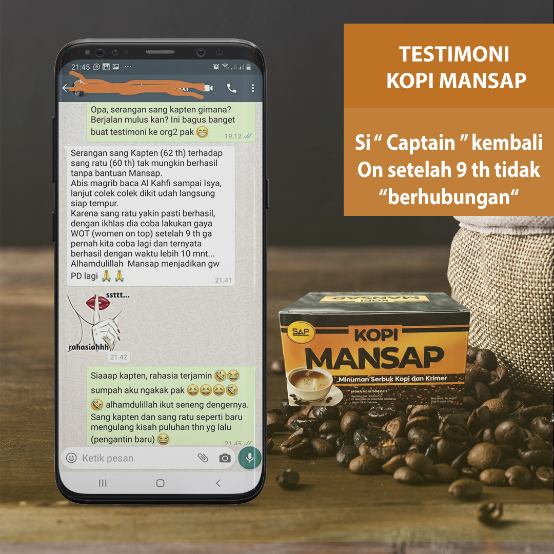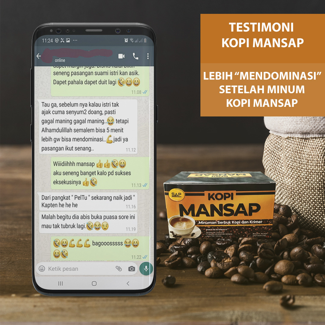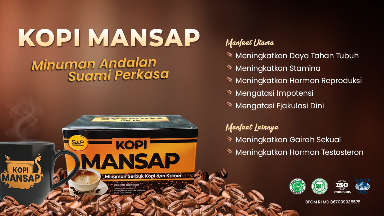 Kopi MANSAP merupakan minuman suplemen kopi herbal untuk menambah stamina pria dewasa yang tidak berbahaya bagi tubuh. Efek atas konsumsi rutin produk kopi MANSAP dapat memperpanjang durasi hubungan suami istri atau atasi ejakulasi dini dan disfungsi ereksi (impotensi). Produk kesehatan berbahan baku herbal.